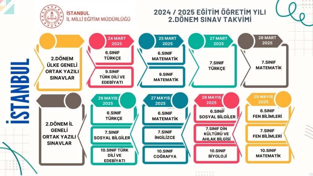 Mazereti olup 2. Dönem 1. Sınavlara katılmayan öğrenciler için ülke geneli ortak yazılı sınavların mazeret sınavları 15 Nisan 2025 Salı günü yapılacaktır.